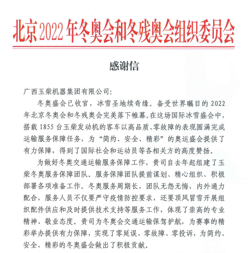 查看詳情3月28日,玉柴收到一封來(lái)自北京冬奧組委的感謝信。這封官方的感謝信為玉柴作為主力軍,以高品質(zhì)、零故障的表現(xiàn)圓滿完成北京冬奧會(huì)的運(yùn)輸服務(wù)保障任務(wù)給予高度肯定。